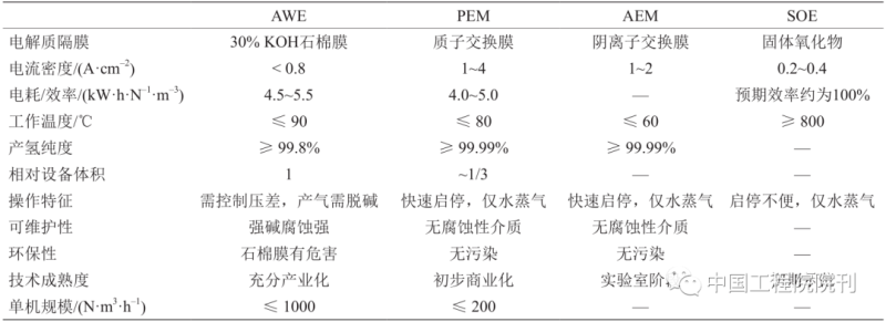 在技術(shù)層面,電解水制氫主要分為AWE、PEM水電解,固體聚合物陰離子交換膜(AEM)水電解、固體氧化物(SOE)水電解,相關(guān)特性對比見表1。