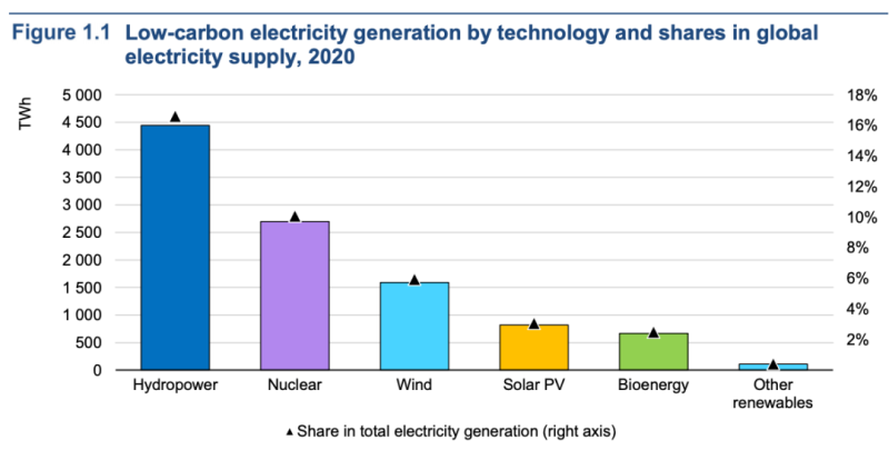 國(guó)際能源署發(fā)布《水電市場(chǎng)特別報(bào)告》,2020年全球水電發(fā)電約4500太瓦時(shí),占全球六分之一的發(fā)電量(僅次于煤炭和天然氣),比核電高55%。水電是全球低碳電力的最大來(lái)源,其發(fā)電量超過(guò)所有其他可再生能源發(fā)電的總和。