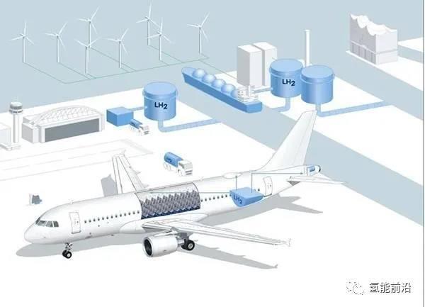 圖說(shuō):液態(tài)氫可能將被應(yīng)用于未來(lái)飛機(jī)(藍(lán)色箭頭)和機(jī)場(chǎng)(地面車(chē)輛)及其周邊(燃料儲(chǔ)存設(shè)備)。藍(lán)色箭頭指向的是飛機(jī)上的潛在應(yīng)用領(lǐng)域:例如可以使用燃料電池為衛(wèi)星通信以及廚房、客艙或IFE系統(tǒng)提供電力 漢堡駐上海聯(lián)絡(luò)處供圖