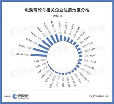 天眼查產(chǎn)業(yè)大數(shù)據(jù)顯示,目前我國有超過73萬家電動兩輪車相關(guān)企業(yè),73%的相關(guān)企業(yè)分布在批發(fā)和零售業(yè)。地域分布上,江蘇的電動兩輪車相關(guān)企業(yè)數(shù)量最多,超過8.5萬家,占比超12%,其中,無錫有8000多家相關(guān)企業(yè),較為知名的有雅迪和新日兩家上市企業(yè)。山東以近8萬家相關(guān)企業(yè)數(shù)量位居第二,河北和河南也均擁有5萬余家相關(guān)企業(yè)。
