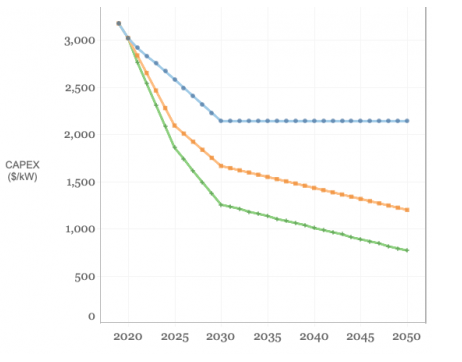美國國家可再生能源實驗室(NREL)2021年度技術基準允許數據集的用戶輸入不同的變量,并以圖形方式查看成本降低的預測,用戶并且可以從該實驗室的網站上訪問和查看。