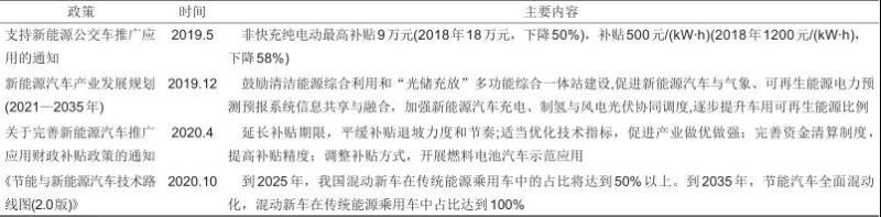 四是新能源汽車(chē)類政策。新能源與電動(dòng)汽車(chē)行業(yè)均為我國(guó)戰(zhàn)略性新興產(chǎn)業(yè),現(xiàn)階段國(guó)內(nèi)汽車(chē)市場(chǎng)乃至全球汽車(chē)市場(chǎng)的發(fā)展重點(diǎn)都在新能源汽車(chē)領(lǐng)域,發(fā)揮新能源汽車(chē)作為移動(dòng)式靈活儲(chǔ)能的調(diào)節(jié)資源,通過(guò)合理的價(jià)格機(jī)制引導(dǎo)電動(dòng)汽車(chē)參與需求側(cè)響應(yīng),在新能源大發(fā)時(shí)段有序發(fā)電,在負(fù)荷用電高峰放電,能有效提升電力系統(tǒng)靈活調(diào)節(jié)和運(yùn)行能力[17]。中國(guó)作為全球領(lǐng)先的新能源汽車(chē)發(fā)展地區(qū),國(guó)內(nèi)市場(chǎng)對(duì)以電動(dòng)車(chē)為主的新能源車(chē)型提供了極佳的發(fā)展環(huán)境。近年來(lái)新能源汽車(chē)類主要政策匯總?cè)绫?所示。