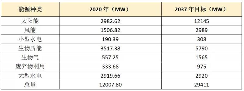 表:泰國(guó)2020年可再生能源發(fā)電裝機(jī)情況和2037年可再生能源發(fā)電裝機(jī)目標(biāo)