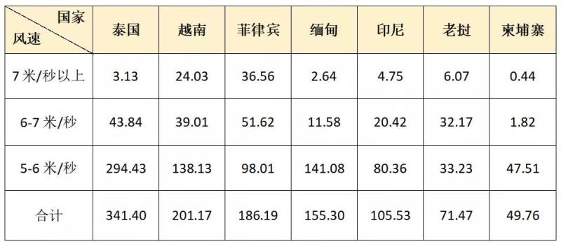 表:東盟主要國(guó)家風(fēng)電技術(shù)可開(kāi)發(fā)量(單位:GW)