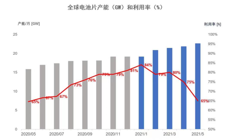 備注:根據(jù)賀利氏內(nèi)部數(shù)據(jù),6月份全球太陽(yáng)能電池片產(chǎn)能利用率進(jìn)一步下降,目前產(chǎn)能利用率保持在65%左右