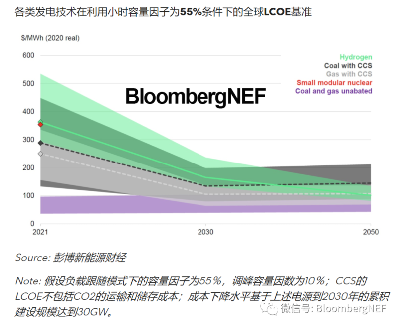 如今,太陽(yáng)能和風(fēng)能已經(jīng)成為電網(wǎng)脫碳的支柱。彭博新能源財(cái)經(jīng)的分析顯示,在電池的配合下,此類(lèi)清潔能源發(fā)電容量有潛力幫助實(shí)現(xiàn)總發(fā)電量的70-80%脫碳。然而,對(duì)于有志于實(shí)現(xiàn)接近凈零排放的國(guó)家來(lái)說(shuō),這還不夠。因此,各類(lèi)使用低碳技術(shù)的可調(diào)度電源開(kāi)始登上舞臺(tái),以滿足清潔能源不足時(shí)的用電需求。本文從成本競(jìng)爭(zhēng)力的角度對(duì)該領(lǐng)域中的三位“種子選手”進(jìn)行了對(duì)比:氫能(hydrogen)、碳捕獲和封存(CCS)以及小型模塊化核反應(yīng)堆(SMR)技術(shù)。