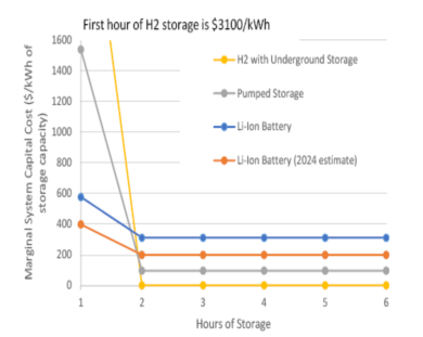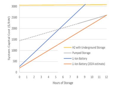 圖3根據(jù)2020年成本估算得出的儲(chǔ)能系統(tǒng)的投資成本與持續(xù)放電時(shí)間之間的簡(jiǎn)化關(guān)系