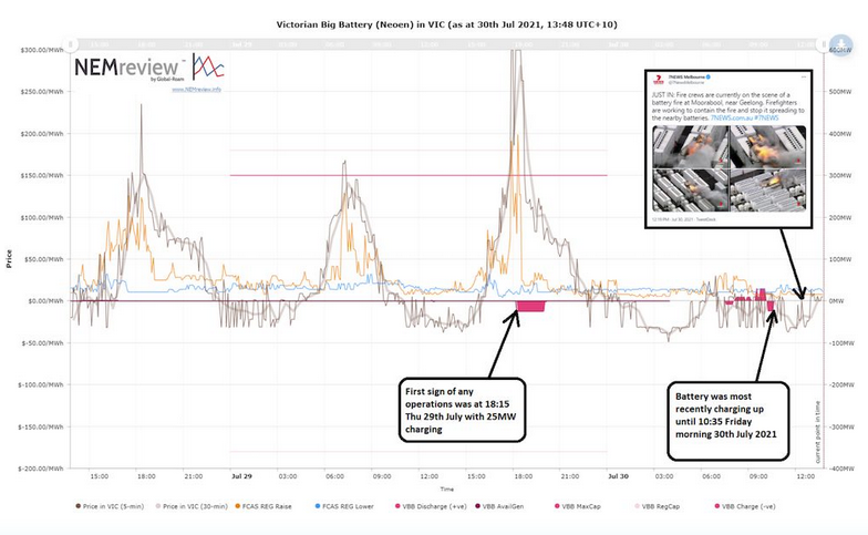 這張來自Watt Clarity的圖片表明,Victoria Big Battery電池儲能系統(tǒng)在火災(zāi)發(fā)生之前的前幾天進(jìn)行了一些測試。