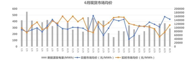在甘肅省6月結(jié)算試運(yùn)行期間,日前市場平均出清價(jià)格319元/MWh,實(shí)時(shí)市場平均出清價(jià)格348元/MWh,日前市場和實(shí)時(shí)市場的出清均價(jià)較5月明顯升高(300/274元/MWh)。但5、6月份甘肅的現(xiàn)貨試運(yùn)行結(jié)果反映出,甘肅現(xiàn)貨市場實(shí)時(shí)價(jià)格與日前市場價(jià)格越來越不耦合。