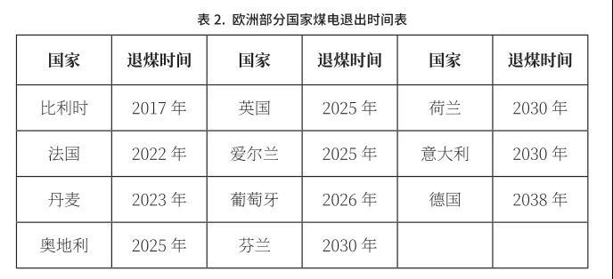 2017年,在德國(guó)波恩舉行的聯(lián)合國(guó)氣候峰會(huì)上,全球助力淘汰煤炭聯(lián)盟(Powering Past Coal Alliance)成立,成員包括丹麥、法國(guó)、芬蘭等20多個(gè)國(guó)家。發(fā)達(dá)國(guó)家特別是歐洲國(guó)家制定了一系列脫碳政策和目標(biāo),并公布了逐步淘汰煤炭的時(shí)間表(見(jiàn)表2)。