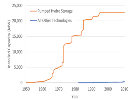 抽水蓄能發(fā)電設(shè)施的建設(shè)和交付周期通常很長,這導致在上世紀90年代以來很少建設(shè)此類項目。圖1顯示了截至2010年這些抽水蓄能電站的累積部署情況,以及其他儲能技術(shù)部署情況(主要是1992年建成的一個壓縮空氣儲能設(shè)施)。