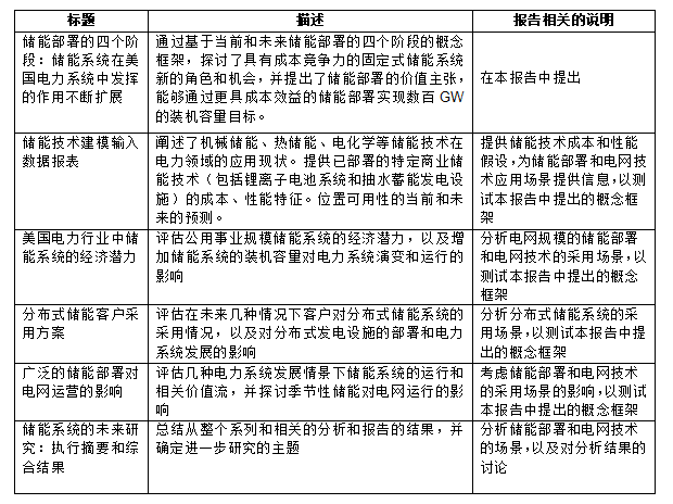 本報告是美國國家可再生能源實驗室(NREL)發(fā)布的“儲能未來研究(SFS)”系列報告之一。儲能未來研究(SFS)是一個持續(xù)多年的研究項目,主要探索儲能系統(tǒng)在美國電力行業(yè)發(fā)展和運營中發(fā)揮的作用和影響。該項目旨在研究儲能技術(shù)的進步對于部署公用事業(yè)規(guī)模儲能系統(tǒng)和分布式儲能系統(tǒng)的潛在影響,以及對未來電力系統(tǒng)基礎(chǔ)設(shè)施投資和運營的影響。其研究結(jié)果和數(shù)據(jù)將通過一系列出版物對外發(fā)表。下面表格列出將在儲能未來研究(SFS)項目的計劃和研究主題。