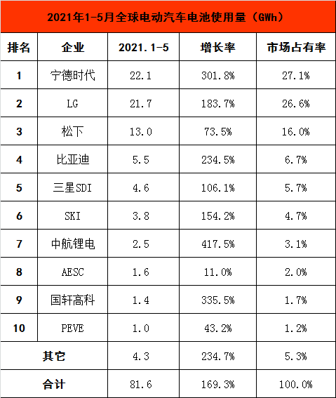 今年5月,得益于國產(chǎn)Model y 銷量猛增,LG能源解決方案動力電池裝機(jī)量驟增至5.7GWh,較之前翻了3.5倍。成功超越寧德時代,自2020年一季度后,再次坐上動力電池裝機(jī)量第一的位置。