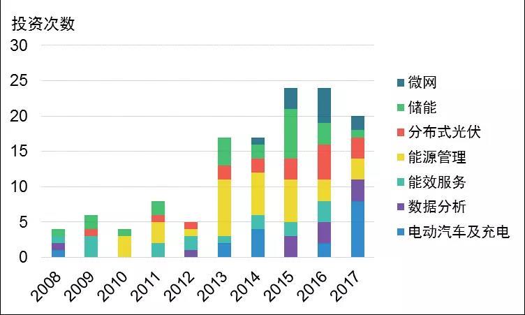 (3)通過風險投資(VC)、私募股權(quán)投資(PE)進行前瞻性布局模式。2013年以來,綜合能源服務(wù)領(lǐng)域的風險投資、私募股權(quán)投資顯著增多。其中對能源管理、儲能、電動汽車及充電投資次數(shù)最多,分別占25%、17%、16%(見圖3)。法國Engie集團是目前進行風險投資最多的公司,廣泛投資電動汽車、儲能、數(shù)據(jù)分析等領(lǐng)域的優(yōu)質(zhì)初創(chuàng)企業(yè),使其能夠緊密追蹤技術(shù)發(fā)展并具有先發(fā)優(yōu)勢。