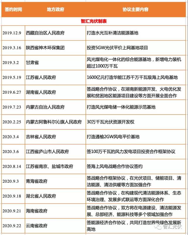 表1:2019、2020年華能集團(tuán)與地方政府簽署的新能源開(kāi)發(fā)協(xié)議一覽