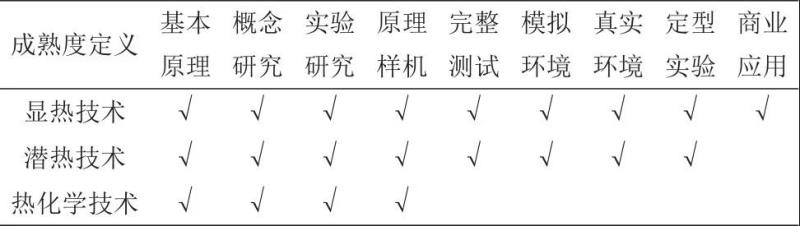 整體而言,不同的儲(chǔ)熱技術(shù)特點(diǎn)和技術(shù)成熟度見(jiàn)表3和表4。從表中可以看出,顯熱儲(chǔ)熱技術(shù)在儲(chǔ)熱規(guī)模、效率、壽命、成本、技術(shù)成熟度等方面具有較大的優(yōu)勢(shì),但是儲(chǔ)能周期較短、能量密度較低等方面也限制了其應(yīng)用發(fā)展,特別是一些儲(chǔ)熱體積限制較大的應(yīng)用場(chǎng)合。潛熱儲(chǔ)熱技術(shù)具有較長(zhǎng)的儲(chǔ)能周期、較大的能量密度、較高的熱效率和較長(zhǎng)的使用壽命,但是其儲(chǔ)能規(guī)模和成本仍需要進(jìn)一步改善,其技術(shù)成熟度也需要進(jìn)一步提高,以達(dá)到商業(yè)應(yīng)用的要求。熱化學(xué)儲(chǔ)熱技術(shù)在儲(chǔ)熱周期、能量密度等方面具有較大的優(yōu)勢(shì),但是儲(chǔ)能規(guī)模、效率、壽命、成本、技術(shù)成熟度需要進(jìn)一步改善,且相關(guān)研究仍處于實(shí)驗(yàn)室驗(yàn)證階段,需要大量的時(shí)間和經(jīng)費(fèi)進(jìn)行基礎(chǔ)研究以推進(jìn)實(shí)際應(yīng)用。