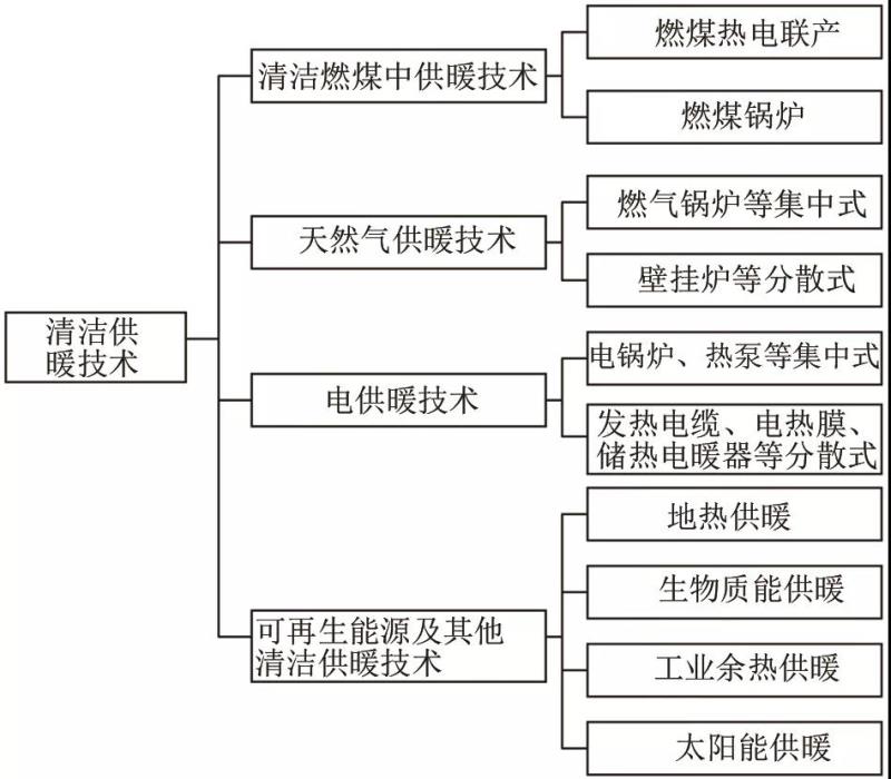 根據(jù)能源種類(lèi),清潔供暖技術(shù)可以分為清潔燃煤集中供暖技術(shù)、天然氣供暖技術(shù)、電供暖技術(shù)、可再生能源及其他清潔供暖技術(shù),見(jiàn)圖1。