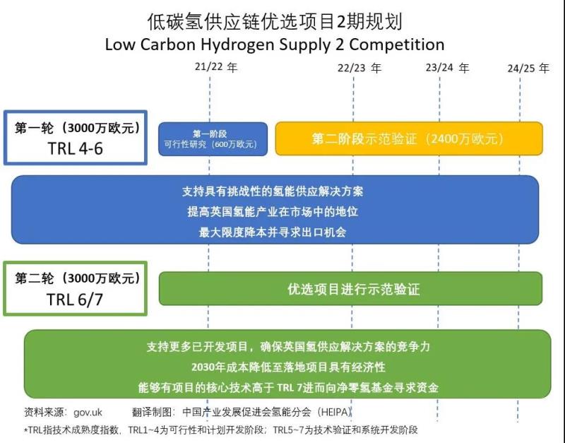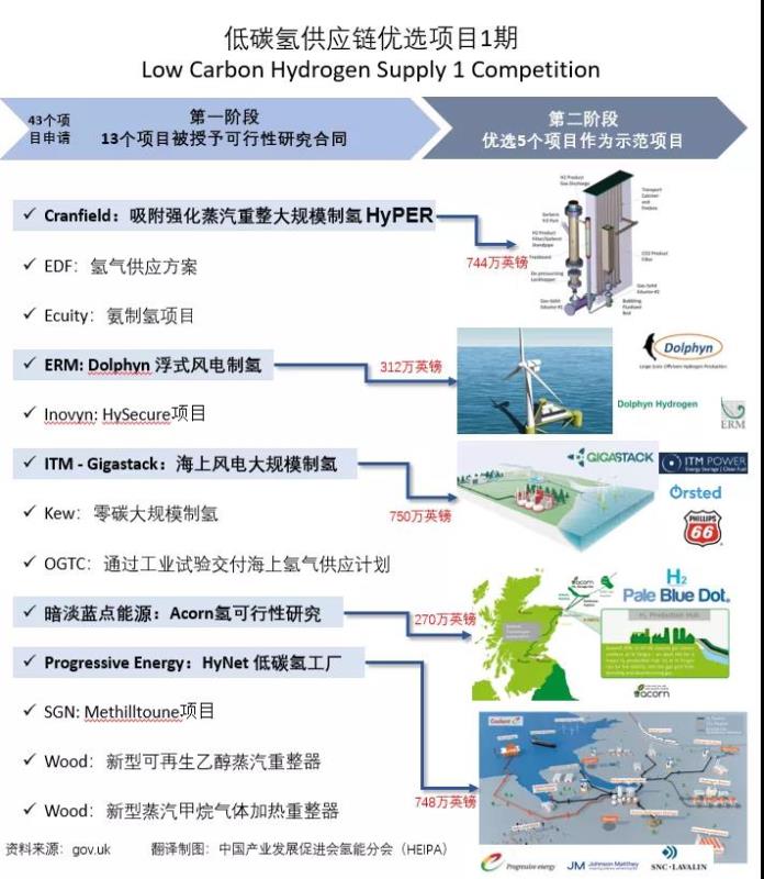 2020年4月,英國(guó)商業(yè)、能源和產(chǎn)業(yè)戰(zhàn)略部(BEIS)發(fā)布了低碳?xì)涔?yīng)優(yōu)選項(xiàng)目(Hydrogen Supply Competition),資助3300萬(wàn)英鎊,重點(diǎn)支持低碳?xì)涔?yīng)解決方案的可行性研究以及典型示范項(xiàng)目的開發(fā)。