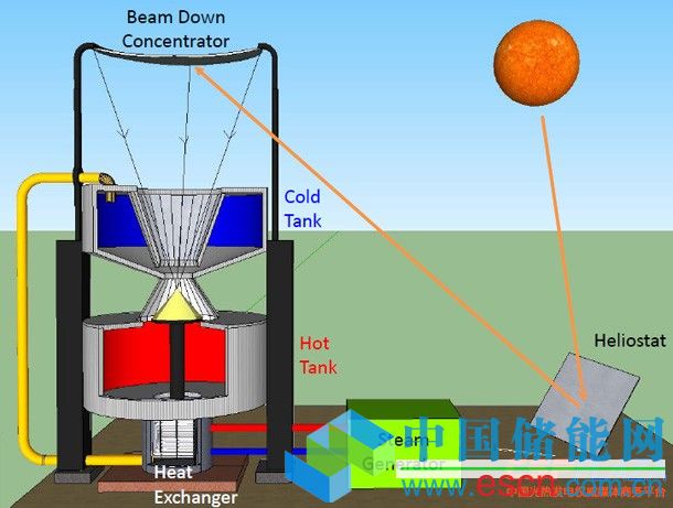 打開冷罐的閥門后,沙子從冷罐中流出,經(jīng)下方的接合處流入熱罐,接合處同時是被聚光后的太陽光線的焦點,沙子在接合處被迅速燒熱,存儲于熱罐中,在需要時再釋放熱能。熱罐內(nèi)部嵌入一個換熱器,水經(jīng)過預熱器、蒸發(fā)器和過熱器產(chǎn)生過熱蒸汽,驅(qū)動汽輪機發(fā)電。高溫沙子釋放能量后利用機械輸送裝置輸回至冷罐,等待進入下一個循環(huán)。從而實現(xiàn)可持續(xù)的密閉循環(huán)工序。