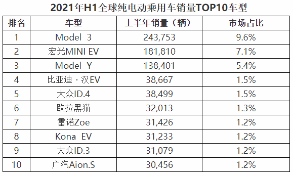 據(jù)統(tǒng)計,今年上半年全球熱銷的TOP10純電動乘用車分別為特斯拉Model3、五菱宏光MINI EV、特斯拉Model Y、比亞迪·漢EV、大眾ID.4、長城歐拉黑貓、雷諾Zoe、現(xiàn)代Kona EV、大眾ID.3、廣汽Aion.S。