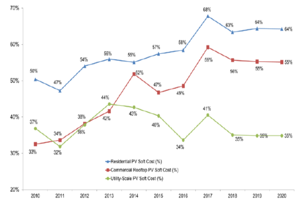·住宅太陽能發(fā)電系統(tǒng)和商業(yè)太陽能發(fā)電系統(tǒng)與公用事業(yè)太陽能發(fā)電系統(tǒng)相比具有更大的軟成本百分比。