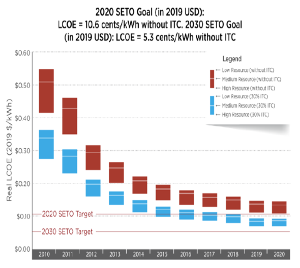 從2010年到2020年,住宅太陽能發(fā)電系統(tǒng)電力成本基準(zhǔn)降低了74%(從2019年到2020年降低了1%),使無補(bǔ)貼的平準(zhǔn)化能源成本(LCOE)在0.11美元/kWh至0.16美元/kWh降到了0.07美元/kWh至0.09美元之間。為了實(shí)現(xiàn)SETO 2020年住宅太陽能發(fā)電系統(tǒng)的平準(zhǔn)化能源成本(LCOE)目標(biāo),即10.6美分/kWh。還使用穩(wěn)態(tài)融資假設(shè)計(jì)算沒有聯(lián)邦稅收抵免(ITC)的太陽能發(fā)電系統(tǒng)平準(zhǔn)化能源成本(LCOE)。在這些假設(shè)下,2020年第一季度無補(bǔ)貼住宅太陽能發(fā)電系統(tǒng)(LCOE)的范圍從0.10美元/kWh到0.14美元/kWh。