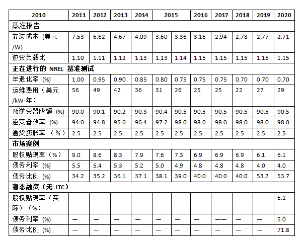 2010~2018年的所有數(shù)據(jù)均來自Fu、Feldman和Margolis(2018年)報(bào)告,并根據(jù)通貨膨脹進(jìn)行了調(diào)整。住宅太陽能發(fā)電系統(tǒng)即平準(zhǔn)化能源成本(LCOE)假設(shè):(1)系統(tǒng)壽命為30年;(2)聯(lián)邦稅率21%;(3)州稅率6%;(4)修正加速成本回收系統(tǒng)(MACRS)折舊計(jì)劃;(5)沒有聯(lián)邦或地方補(bǔ)貼;(6)運(yùn)營資金及償債準(zhǔn)備金占到運(yùn)營成本及償還債務(wù)的6個(gè)月(利率為1.75%);(7)三個(gè)月期建設(shè)貸款,利率為4%,手續(xù)費(fèi)為系統(tǒng)成本的1%;(8)發(fā)電模塊傾角為25度,方位角180度;(九)18年期限的債務(wù);(10)1億美元住宅項(xiàng)目池的TPO交易的110萬美元前期金融交易成本;(11)來自Feldman、Bolinger和Schwabe(2020年)的2019年和2020年財(cái)務(wù)假設(shè)。