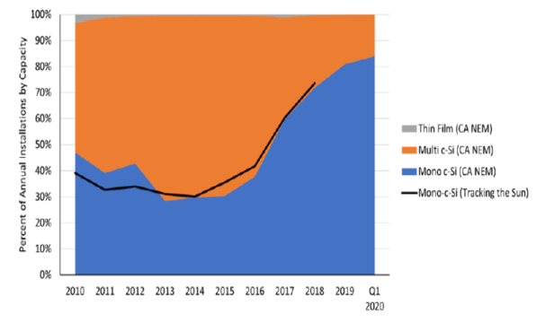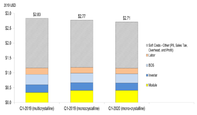 在2020年第一季度基準(zhǔn)報(bào)告中,使用單晶硅太陽能發(fā)電組件而不是之前的多晶硅太陽能發(fā)電組件對系統(tǒng)進(jìn)行建模,因?yàn)樽詮?016年以來美國市場轉(zhuǎn)向使用更多的單晶硅太陽能發(fā)電組件。