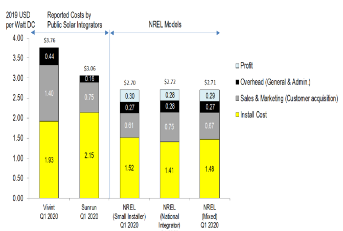 自下而上的建模方法產(chǎn)生的成本結(jié)構(gòu)不同于太陽能發(fā)電集成商在其公司文件中提到的成本結(jié)構(gòu)。由于集成商銷售和租賃太陽能發(fā)電系統(tǒng),他們采用與只是銷售商品的銷售商不同的報(bào)告成本方法。租賃太陽能發(fā)電系統(tǒng)的許多成本是在租賃期限內(nèi)產(chǎn)生的,而不是在銷售期間產(chǎn)生的,因此很難確定銷售的實(shí)際成本。盡管太陽能發(fā)電開發(fā)商Sunrun公司和Vivint Solar公司的文件按照季度來報(bào)告系統(tǒng)成本,但由于其公開文件缺乏透明度,因此很難確定這些成本的準(zhǔn)確性。安裝成本的部分差異可能會(huì)出現(xiàn)來自太陽能發(fā)電集成商在2020年第一季度安裝的系統(tǒng)中使用的先前合同。