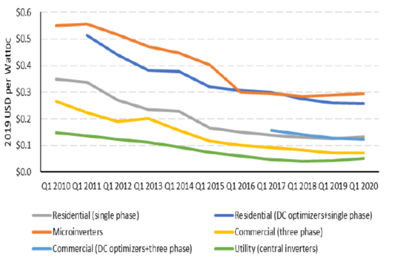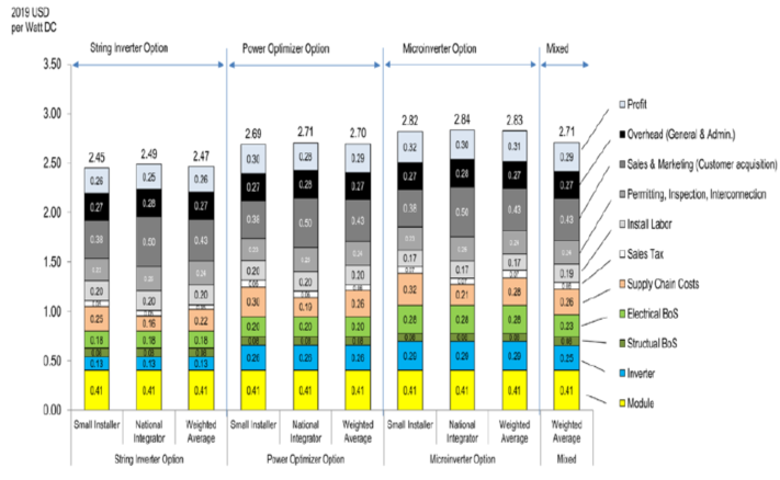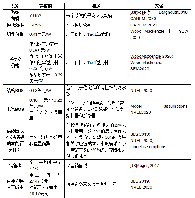 對于住宅太陽能系統(tǒng)成本計(jì)算,分別對組串級(jí)逆變器、功率優(yōu)化器和微型逆變器選項(xiàng)進(jìn)行建模,并在加權(quán)平均情況下在2020年第一季度模型中使用它們的市場份額(14.6%、49.8%和35.6%)。