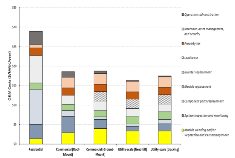 在2018年,美國能源部下屬的太陽能發(fā)電系統(tǒng)運(yùn)營和維護(hù)(O&M)工作組開發(fā)了一個(gè)模型用來計(jì)算與太陽能發(fā)電系統(tǒng)運(yùn)維相關(guān)的成本。成本模型中的133項(xiàng)措施分為9個(gè)運(yùn)維成本類別:逆變器更換、運(yùn)營管理、模塊更換、零部件更換、系統(tǒng)檢查和監(jiān)控、模塊清潔和/或植被和蟲害管理、土地租賃、財(cái)產(chǎn)稅、以及保險(xiǎn)、資產(chǎn)管理和安全。目前的成本基準(zhǔn)是28.94美元/kW/年(住宅太陽能發(fā)電系統(tǒng))、18.55美元/kW/年(商業(yè)和住宅太陽能發(fā)電系統(tǒng))、18.71美元/kW/年(商業(yè)和地面安裝的太陽能發(fā)電系統(tǒng))、16.32美元/kW/年(公用事業(yè)規(guī)模太陽能系統(tǒng))和17.46美元/kW/年(公用事業(yè)規(guī)模太陽能系統(tǒng),單軸跟蹤器)