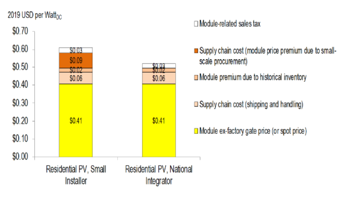 而在2020年第一季度住宅太陽能成本基準(zhǔn)中,其供應(yīng)鏈成本相當(dāng)于0.02美元/W(6%)的溢價(jià)。假設(shè)小型太陽能發(fā)電系統(tǒng)安裝商和集成商在組件運(yùn)輸和處理的現(xiàn)貨價(jià)格基礎(chǔ)上均需支付15%(0.06美元/W)的溢價(jià),這與2018年第一季度住宅太陽能發(fā)電系統(tǒng)的基準(zhǔn)一致。由于采購規(guī)模較小,小型太陽能發(fā)電系統(tǒng)安裝商需額外支付20%(0.09美元/W)的溢價(jià)。這兩種類型的公司還需繳納5%的銷售稅,因此小型太陽能發(fā)電模塊的成本為0.61美元/W,集成商的成本為0.52美元/W。