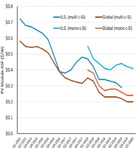 假設(shè)2020年第一季度Tier1單晶硅太陽能發(fā)電組件的出廠價(jià)(現(xiàn)貨或首次購買者)為0.41美元/W。雖然全球太陽能發(fā)電組件現(xiàn)貨價(jià)格正在持續(xù)下跌,但美國現(xiàn)貨價(jià)格卻在2017年上漲。包括美國對進(jìn)口太陽能發(fā)電模塊的限制政策在內(nèi)的一些因素可能導(dǎo)致了美國和全球現(xiàn)貨價(jià)格之間的差異。美國現(xiàn)貨價(jià)格在2018年初再次開始下跌,并且在2020年第一季度繼續(xù)下跌,接近歷史最低水平,但單晶硅太陽能發(fā)電組件的交易價(jià)格仍高于全球組件平均銷售價(jià)格。