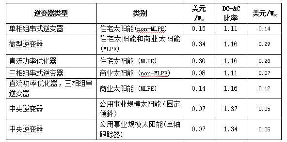 報(bào)告使用不同的DC-AC比率(上表)將美元/WAC價(jià)格從之前的逆變器價(jià)格數(shù)字轉(zhuǎn)換為美元/WDC。而在基準(zhǔn)測試中,使用美元/WDC計(jì)算所有成本,其中包括逆變器價(jià)格。該報(bào)告使用勞倫斯伯克利國家實(shí)驗(yàn)室的數(shù)據(jù)更新了逆變器DC-AC比率。