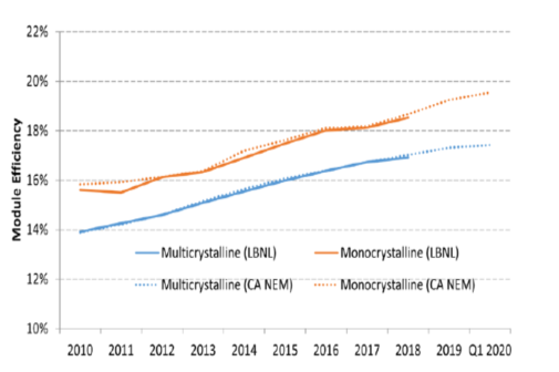 自從2010年以來,單晶硅和多晶硅的太陽能發(fā)電模塊組件效率逐漸提升,60片和72片多晶硅組件的效率每年平均增長0.3%~0.4%。2020年第一季度調(diào)查表明,單晶組件效率已經(jīng)達(dá)到19.5%。由于組件選擇可能因地區(qū)和行業(yè)而異,因此其效率和價(jià)格可能有所不同。
