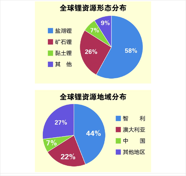目前,澳洲鋰礦和南美鹽湖是全球鋰資源供應(yīng)主力。根據(jù)五礦證券數(shù)據(jù),從形態(tài)分布來看,全球鹽湖鋰、礦石鋰以及黏土鋰分別占比58%、26%和7%;以地域分布來看,智利、澳大利亞在全球探明鋰儲量中占比分別為44%、22%,中國以7%的占比位居第三。