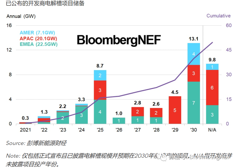 為應(yīng)對銷售不斷增長的局面,電解槽制造商在建工廠的數(shù)量超過所需量。2024年前約有16GW的產(chǎn)能投產(chǎn),足以滿足數(shù)倍的需求。這可能導(dǎo)致很多工廠利用率不足,從而壓低價(jià)格。