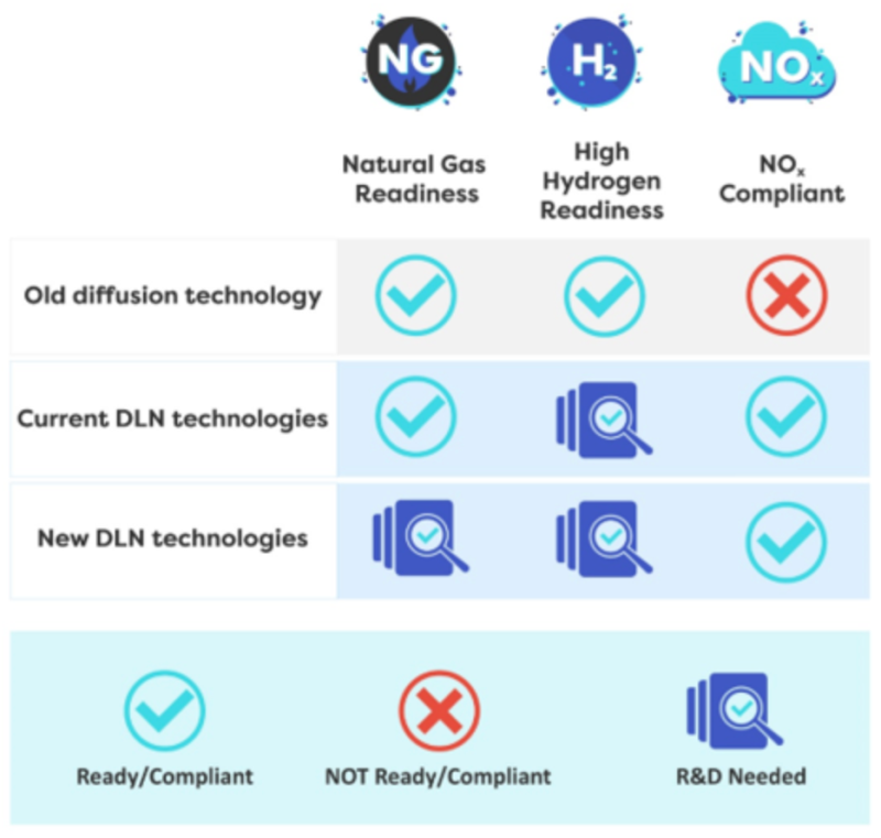 總之,氫無疑是一種可接受的、非常清潔的燃料。目前存在H2水平50%,與天然氣共同使用的低NOx燃氣輪機;也已經(jīng)開發(fā)出了用純氫操作的系統(tǒng)。未來的關鍵發(fā)展挑戰(zhàn)是低NOx、燃料柔性系統(tǒng),該系統(tǒng)可以在純天然氣到從純氫氣之間等多種燃料成分下輕松操作。下圖概述了這些不同技術使用氫氣的成熟度、研發(fā)需求和NOx合規(guī)性。