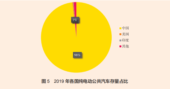 實(shí)現(xiàn)碳中和,不僅是電力生產(chǎn)側(cè)的零碳革命,也必須要求能源消費(fèi)側(cè)的顛覆性技術(shù)革命。汽車是石油革命的產(chǎn)物,是石油產(chǎn)品終端消費(fèi)的主體。碳中和意味著改進(jìn)型技術(shù)的徹底退出,顛覆性技術(shù)的全面替代。純電動(dòng)汽車或其他形式的新能源汽車,全面取代碳基燃料的燃油汽車,是碳中和終端消費(fèi)或需求側(cè)的不二途徑(IRENA,2021b)。如果燃油汽車不能被顛覆,則石油消費(fèi)和煉化的排放,將因?yàn)樯鐣?huì)的需求剛性不可能清零。汽車燃油效率無論怎么提高,都只能低碳,不可能實(shí)現(xiàn)零碳。而純電動(dòng)汽車不需要燃油或燃?xì)?,只要電力源自于可再生能源,就可以?qū)動(dòng)。從某種程度來說,純電動(dòng)汽車也可以是間歇性風(fēng)電、光伏發(fā)電的儲能設(shè)施。在純電動(dòng)汽車領(lǐng)域,中國也是后來而居上者。一些國家明確了禁止燃油汽車的時(shí)間表,中國也在2020年11月發(fā)布新能源汽車發(fā)展規(guī)劃,明確到2025年,純電動(dòng)汽車在新車市場的銷售要占到20%左右,2035年成為新車市場的主流。目前,我國純電動(dòng)汽車的保有量穩(wěn)居世界第一,純電動(dòng)公共汽車占全球比例高達(dá)98.2%(見圖4、圖5),其中,深圳市公共交通車輛已全部實(shí)現(xiàn)電動(dòng)化。