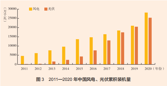 在顛覆性技術(shù)的研發(fā)、應(yīng)用方面,后來者可以居上。2000年前后,中國風(fēng)力發(fā)電和光伏發(fā)電的概念在媒體和技術(shù)研究中均較為少見。到2010年前后,中國的風(fēng)、光電力設(shè)備的生產(chǎn)、安裝和使用,才真正起步。之后,中國的發(fā)展突飛猛進(jìn),從微不足道到獨(dú)領(lǐng)風(fēng)騷,只用了10年多時(shí)間。中國電力大數(shù)據(jù)顯示(見圖3),2011—2020年,中國的光伏裝機(jī)從212萬千瓦猛增到2億5千多千瓦,增加了119倍!其間,光伏上網(wǎng)電價(jià)補(bǔ)貼從每度電2元到2018年后的平價(jià)上網(wǎng),市場競爭力超過煤電。中國的光伏組件在世界上具有較大的競爭優(yōu)勢,以至于歐美發(fā)達(dá)國家冒天下之大不韙,直接干擾國際市場交易,動(dòng)用“雙反”手段打壓中國產(chǎn)品。