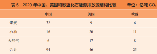 前文中的時(shí)間進(jìn)程和重點(diǎn)聚焦表明,中國要實(shí)現(xiàn)碳中和,必須要求化石能源消費(fèi)清零,而首先要?dú)w零的是煤炭。我國的資源稟賦是多煤少油缺氣,煤炭在我國工業(yè)化城市化進(jìn)程中,一直占據(jù)絕對高的比重。21世紀(jì)初,煤炭在我國能源消費(fèi)的比例超過70%。2010年之后,隨著油氣進(jìn)口規(guī)模的擴(kuò)大和大氣污染管控的趨嚴(yán),2020年煤炭在一次能源消費(fèi)中的占比降至56.8%。即便如此,發(fā)達(dá)國家在2030年前后就能實(shí)現(xiàn)去煤,而我國即使是在2055年徹底去煤,煤炭占比每年至少也要減少1.5個(gè)百分點(diǎn)。相比美國和歐盟的化石能源排放源結(jié)構(gòu)(見表5),中國的化石能源排放超過美國1倍,相當(dāng)于歐盟的4倍,但煤炭的排放卻相當(dāng)于美國的7倍,歐盟的12倍。雖然中國的經(jīng)濟(jì)發(fā)展水平低于發(fā)達(dá)國家,但需要?dú)w零的化石能源消費(fèi)總量和高碳的煤炭,卻高出發(fā)達(dá)國家1倍乃至10倍以上。