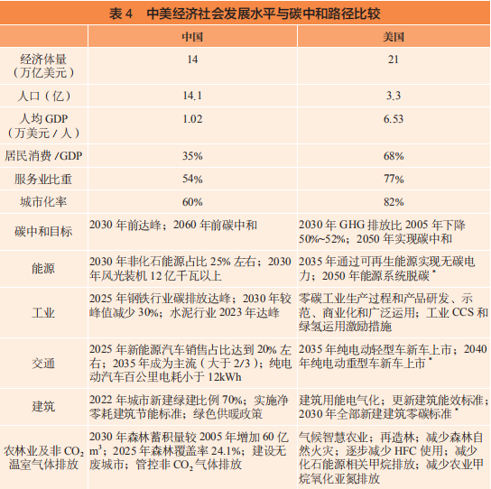 德國碳達(dá)峰實(shí)現(xiàn)得較早,碳中和緩沖期較為充裕。但對于美國來說,其能源消費(fèi)一直處于高位水平,而且由于與歐洲人生活方式的差異,其人均排放超過歐盟的一半,二氧化碳排放軌跡也表現(xiàn)出較長時(shí)間的高位平臺期,峰值遲至2005年前后才出現(xiàn),化石能源消費(fèi)所排放的二氧化碳峰值大約為59億噸,目前已經(jīng)低于50億噸(BP,2020)。美國需從2005年開始(或目前的50億噸),45年時(shí)間減59億噸(或30年時(shí)間減50億噸)。從中美碳中和的實(shí)現(xiàn)路徑來看(見表4):第一,美國早已達(dá)峰,目前進(jìn)入絕對量減排階段,2030年的目標(biāo)是比2005年的排放水平減少一半,而中國的目標(biāo)是在2030年前實(shí)現(xiàn)達(dá)峰;第二,如果從現(xiàn)在起步,中國的減排總量超過美國的1倍,時(shí)間卻只滯后10年,但中國的經(jīng)濟(jì)發(fā)展水平、經(jīng)濟(jì)結(jié)構(gòu)和城市化水平,遠(yuǎn)遠(yuǎn)不具備美國的優(yōu)勢,滯后時(shí)間遠(yuǎn)不只10年;第三,美國的技術(shù)和脫碳進(jìn)程領(lǐng)先于中國,值得中國借鑒;第四,中國的可再生能源發(fā)展水平和規(guī)模,要領(lǐng)先于美國,中國規(guī)劃在2030年風(fēng)光裝機(jī)超過12億千瓦,幾乎是美國當(dāng)前發(fā)電裝機(jī)的總和,從這一意義上講,中國走向碳中和,有難度,但也有優(yōu)勢。