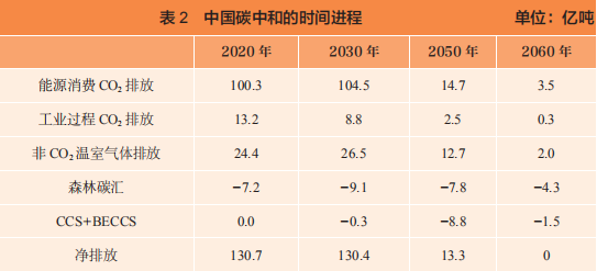 表2給出了中國實(shí)現(xiàn)《巴黎協(xié)定》控制2℃溫升目標(biāo)和1.5℃溫升目標(biāo)的減排時(shí)間表。顯然,化石能源消費(fèi)產(chǎn)生的二氧化碳排放是絕對主體,非二氧化碳排放,尤其是甲烷,原則上也應(yīng)該有40%左右的排放歸入化石能源。因而,在相當(dāng)程度上講,化石能源消費(fèi)的清零過程就是碳中和的時(shí)間進(jìn)程。