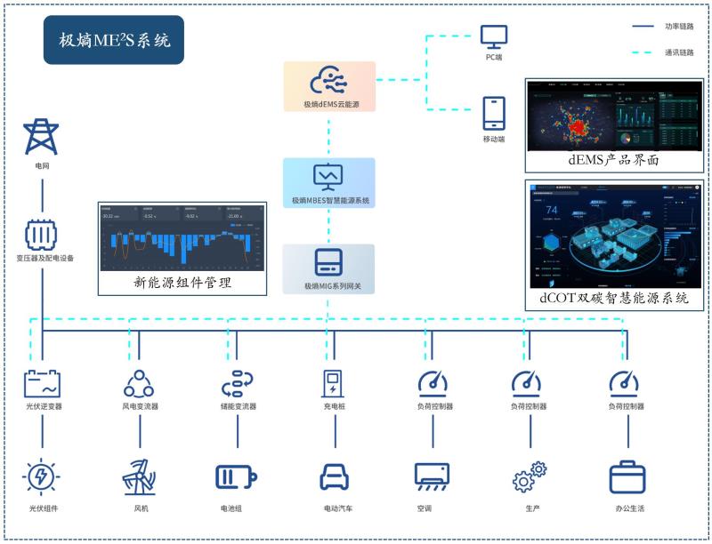 極熵目前最核心的產(chǎn)品“極熵ME2S”雙碳智慧能源系統(tǒng)涵蓋了極熵自研的dCOT碳追跡系統(tǒng)和dEMS智慧能源管理系統(tǒng),并集成了一整套的智慧光儲充聯(lián)動系統(tǒng),為區(qū)域、園區(qū)和企業(yè)的雙碳目標達成、智慧能源管理提供一站式解決方案。
