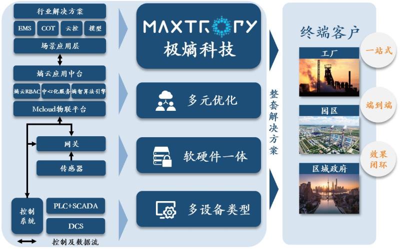 我們產(chǎn)品最突出的特點的就是極熵原創(chuàng)的領先技術(shù)內(nèi)核。這來源于極熵過去多年對智慧能源網(wǎng)絡這一復雜網(wǎng)絡優(yōu)化問題的長期探索?;跀?shù)據(jù)和人工智能的算法在這里賦予了極熵產(chǎn)品對于降碳、降本、增效、無人這一組多目標優(yōu)化聯(lián)立方程的實時預測和解答能力,而極熵在應用技術(shù)側(cè)的一整套自有知識產(chǎn)權(quán)邊緣計算設備、PaaS平臺和多個成熟原子級應用的落地能力也保證了這一套算法在客戶側(cè)能夠快速實施并產(chǎn)生價值。