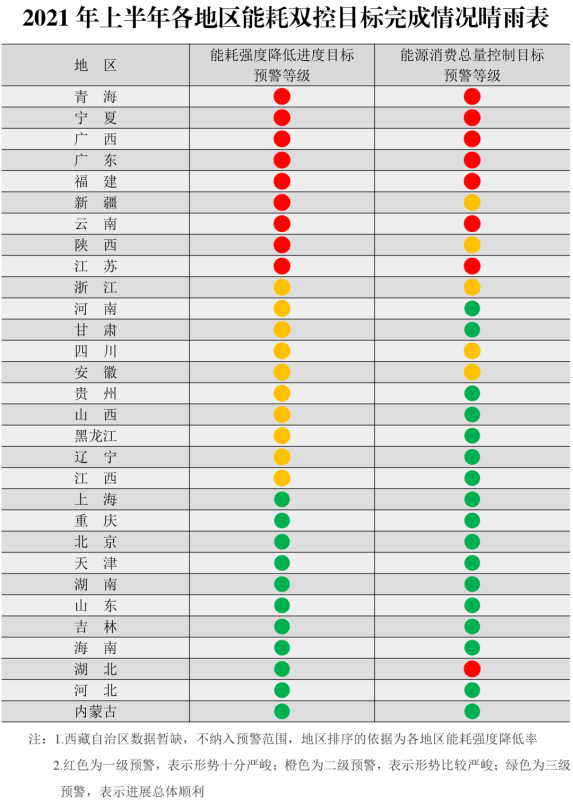 為貫徹落實(shí)黨中央、國務(wù)院關(guān)于強(qiáng)化能耗雙控的決策部署,加強(qiáng)能耗雙控形勢分析預(yù)警,根據(jù)上半年各地能源消費(fèi)情況,我們制定了《2021年上半年各地區(qū)能耗雙控目標(biāo)完成情況晴雨表》,現(xiàn)印發(fā)給你們。