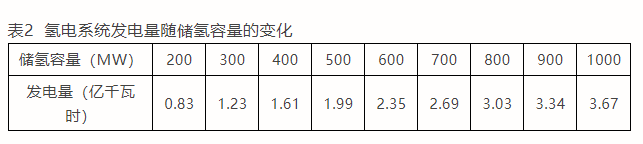 仍以內(nèi)蒙古風(fēng)光資源較好的地區(qū)為例,以電源基地風(fēng)電/光伏/火電裝機(jī)規(guī)模為4000MW/8000MW/4000MW、配置1000MW/2000MWh鋰離子儲(chǔ)能為基礎(chǔ)條件,儲(chǔ)氫時(shí)長(zhǎng)6小時(shí),儲(chǔ)氫容量從200MW增加至1000MW,以可再生能源電解水制氫—?dú)怏w儲(chǔ)氫—?dú)淙剂想姵匕l(fā)電體系的氫電系統(tǒng)發(fā)電量隨儲(chǔ)氫容量變化如表2所示。