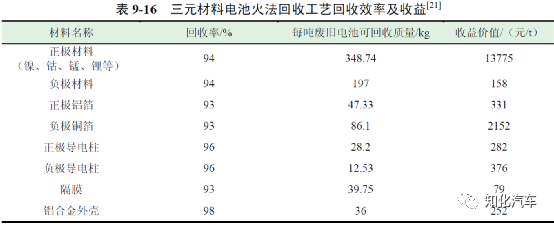 濕法回收工藝的成本主要來源于原材料回收成本、廢水廢棄物處理等方面,表9-12 為每噸廢舊電池濕法回收工藝處理成本。濕法回收工藝每處理一噸三元電池的平均成本為14815 元,每處理一噸磷酸鐵鋰電池的平均成本為9915 元。此外,采用濕法回收工藝對電池有價值材料回收的效率較高,因此收益情況也更明顯。