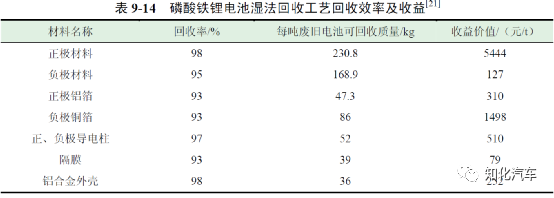 此外,三元材料電池和磷酸鐵鋰電池火法回收工藝回收效率及收益如表9-16 和表9-17 所示。從以上數(shù)據(jù)可以得知采用火法回收工藝回收每噸三元電池的平均收益為17405 元,回收每噸磷酸鐵鋰電池的平均收益為7994 元。因此,采用火法回收工藝每回收一噸三元電池將盈利3015 元,每回收一噸磷酸鐵鋰電池將虧損1496 元。