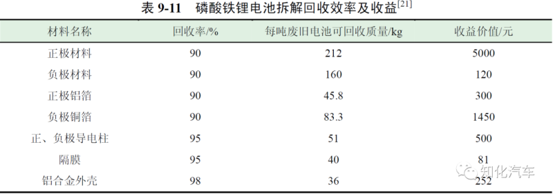 表9-10 為三元材料電池拆解回收效率及收益。每噸三元材料電池經(jīng)拆解后回收有價值金屬和材料的平均收益為16728 元。此外,經(jīng)過調(diào)研,對磷酸鐵鋰電池拆解收益情況也進行了分析,磷酸鐵鋰電池拆解回收效率及收益如表9-11 所示。拆解每噸磷酸鐵鋰電池回收有價金屬和材料的收益約為7703 元。從前面分析數(shù)據(jù)可以看出,采用物理法回收每噸三元材料電池的拆解成本為13264 元,通過銷售拆解后得到的有價值材料獲得的收益為16728 元,因此,拆解回收每噸三元電池可盈利3464元;而每噸磷酸鐵鋰電池拆解成本為8364 元,收益為7703 元,因此拆解回收每噸磷酸鐵鋰電池將虧損661 元。